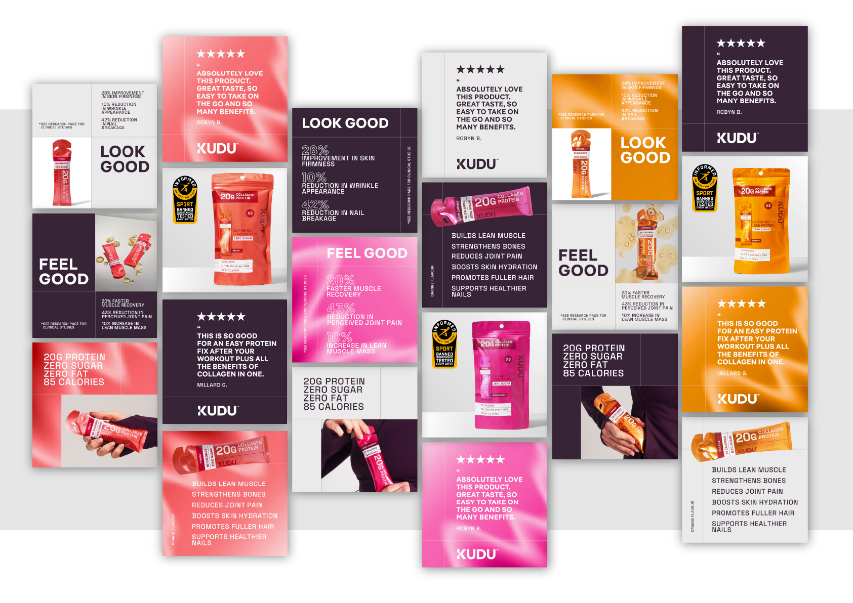 While freelancing for The Loft, I developed a social and web image suite for KUDU Nutrition. The Loft’s design team had created a clean, contemporary brand identity with bold colour accents to distinguish flavours and bring energy to the range. My work then used there brand guidelines to build this image set to support the launch of there website and social media platforms.