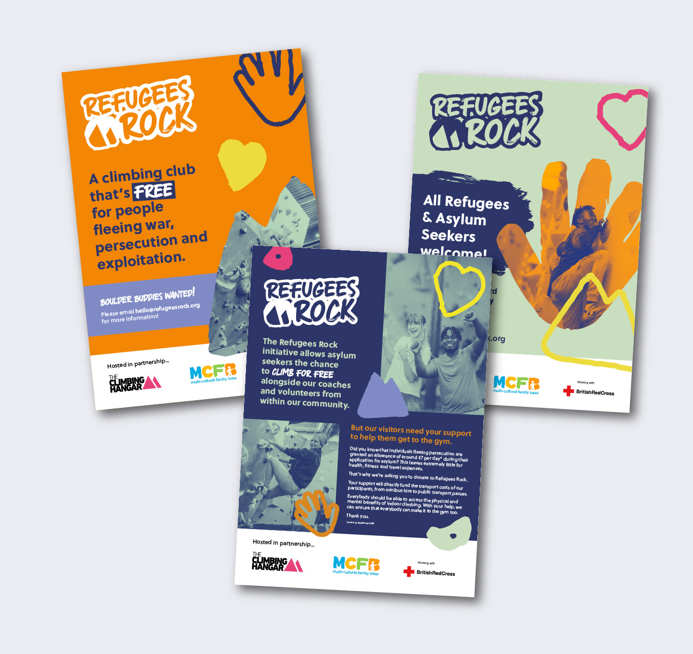 Refugees Rock is a free climbing club for people fleeing war, persecution and exploitation founded by Action Asylum, The Climbing Hangar and The British Red Cross. The brand was requested to hold some visual similarities to its title founder TCH whilst adopting a fresh friendly colour palette and asset set to support its roll out.